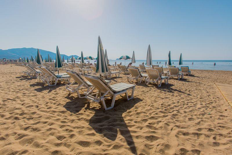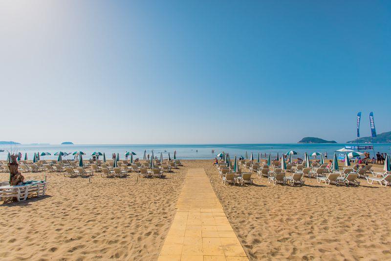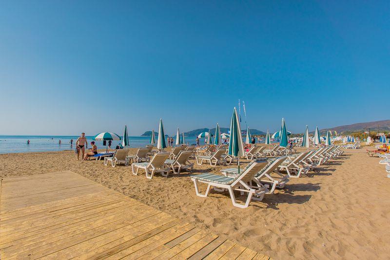krásna piesková pláž • pozvoľný vstup do mora • ležadlá a slnečníky za poplatok • centrum vodných športov za poplatok
