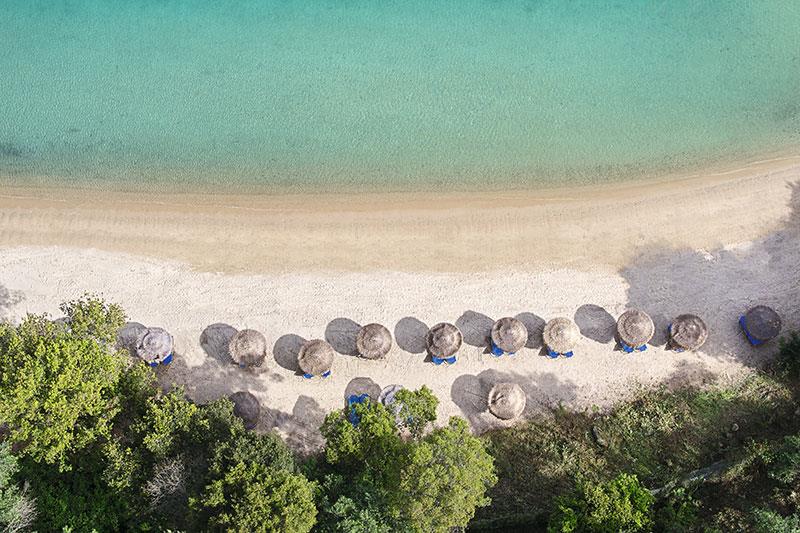 zátoka s pieskovou plážou a jemnými kamienkami • pozvoľný vstup do mora • centrum vodných športov za poplatok • bezplatný plážový servis
