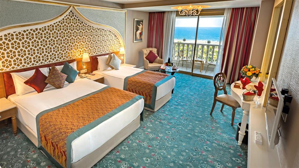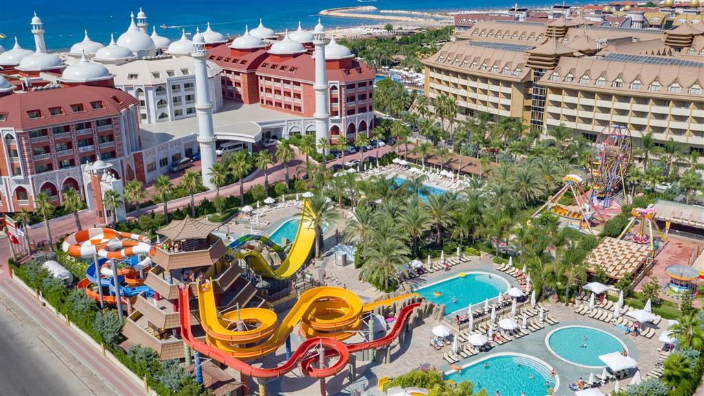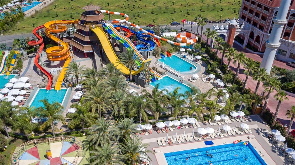 hlavná reštaurácia • 3 à la carte reštaurácie • snack bar • bistro• cukráreň • 4 bary • diskotéka • nákupná pasáž • bezplatné Wi-Fi pripojenie • konferenčné priestory • SPA centrum • lekár • vonkajší bazén • plavecký bazén • relaxačný bazén • aquapark so šmýkačkami pre deti aj dospelých • vnútorný bazén • detské bazény • vnútorný detský bazén • detské ihrisko • miniklub • minidisco • lunapark • plážový volejbal • fitnescentrum • tenis • stolný tenis • šípky • lukostreľba • minifutbal • pestrý športový program • medzinárodný animačný tím